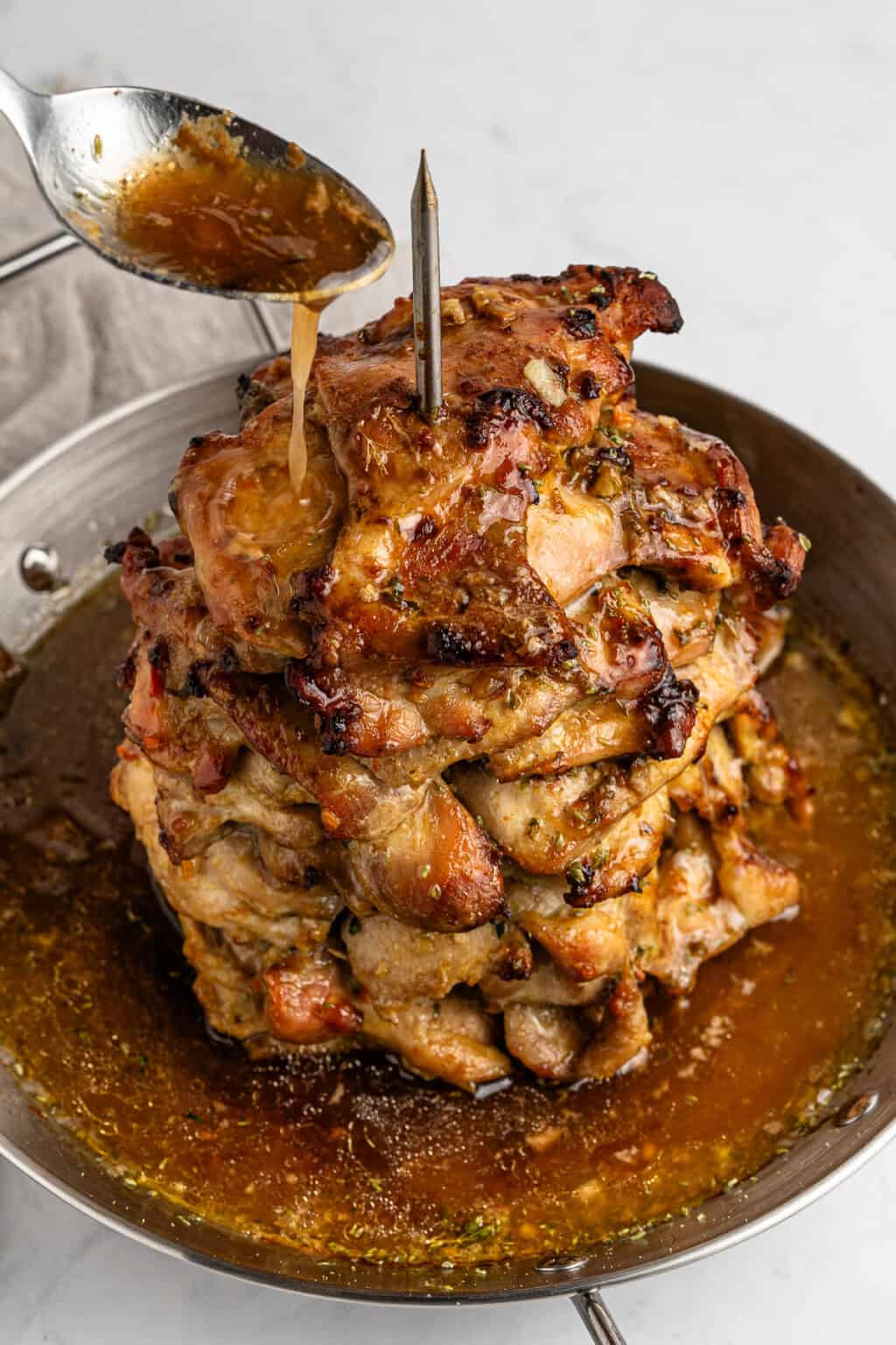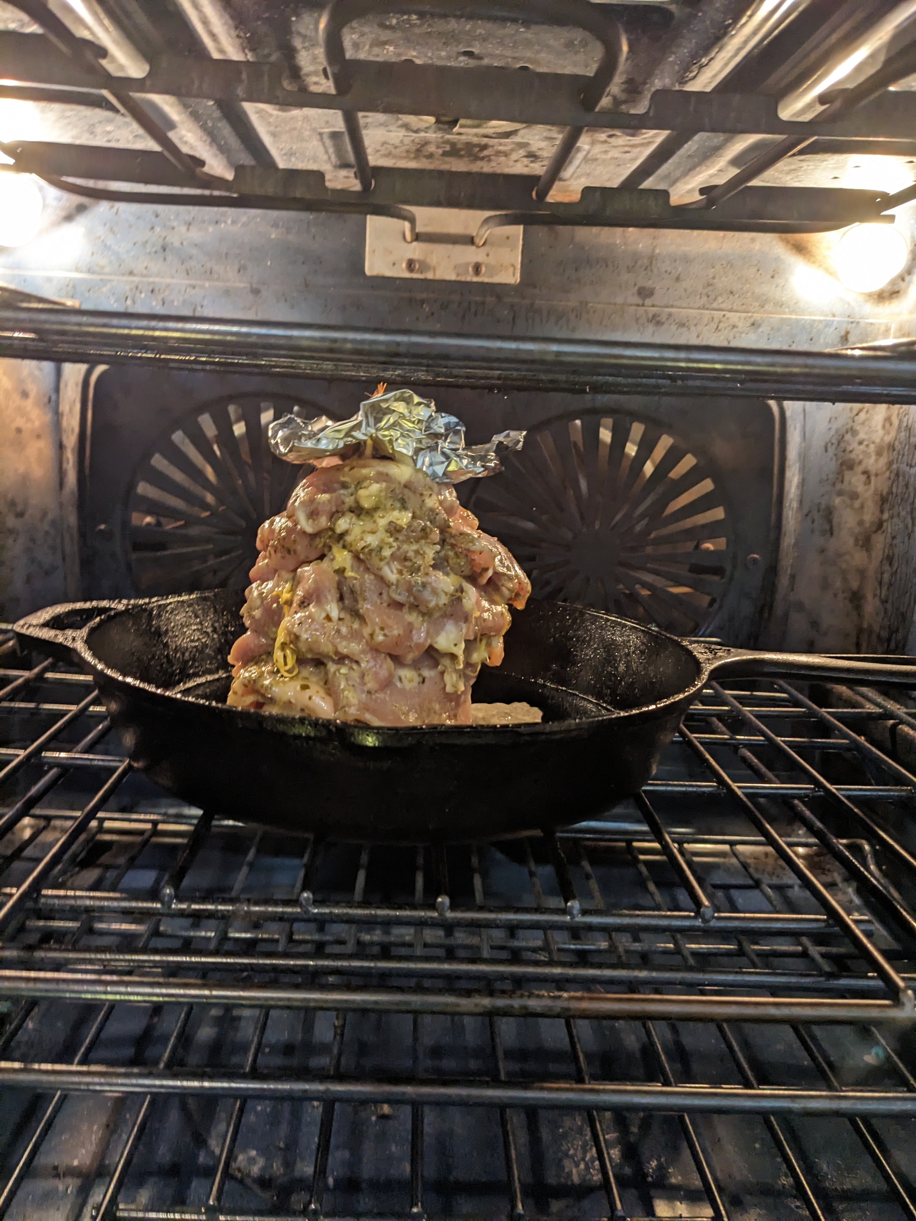 Tip: you can pierce a small piece of foil making sure to cover the top chicken thigh as it will start to burn first on the top as it bakes.