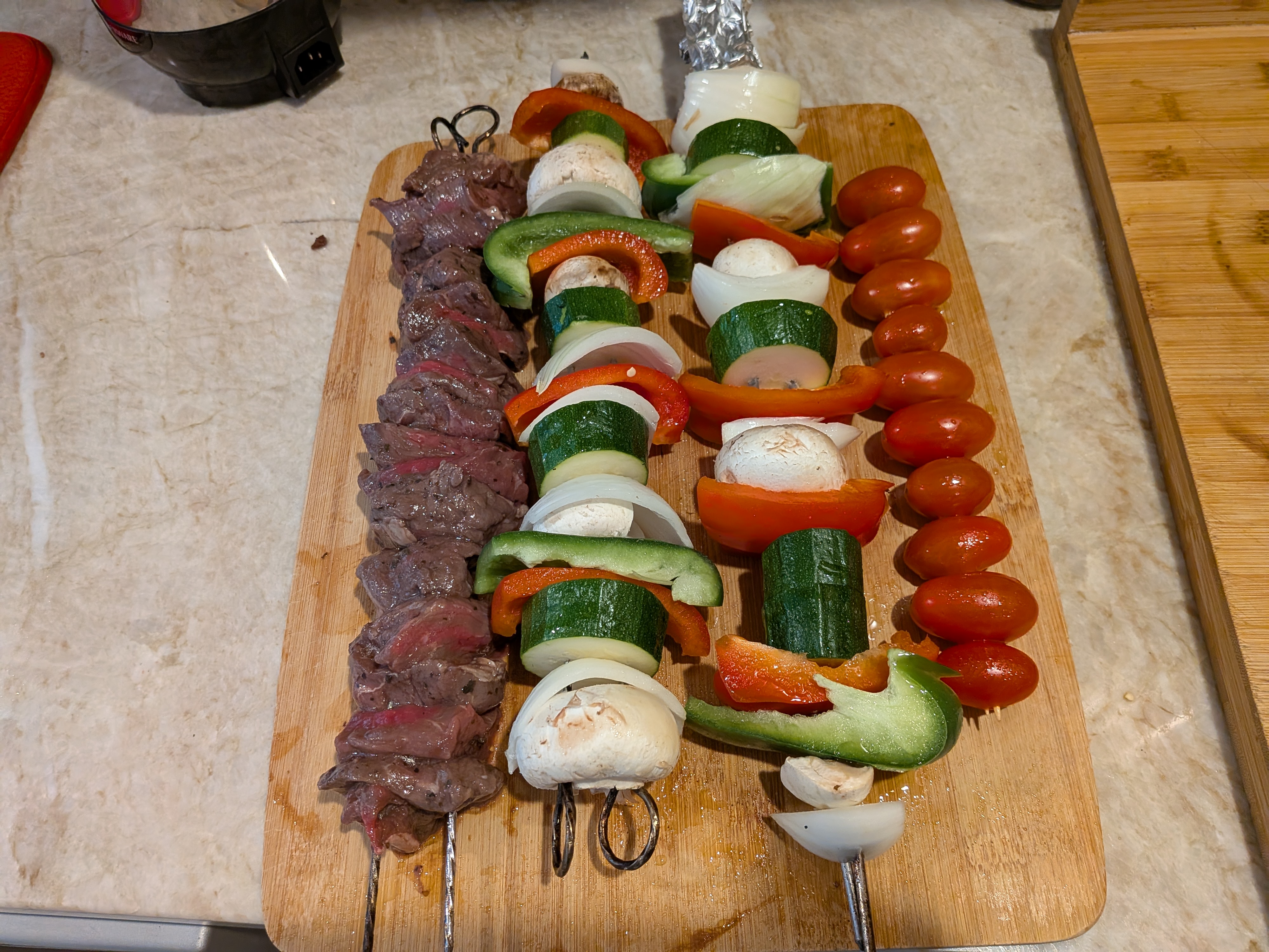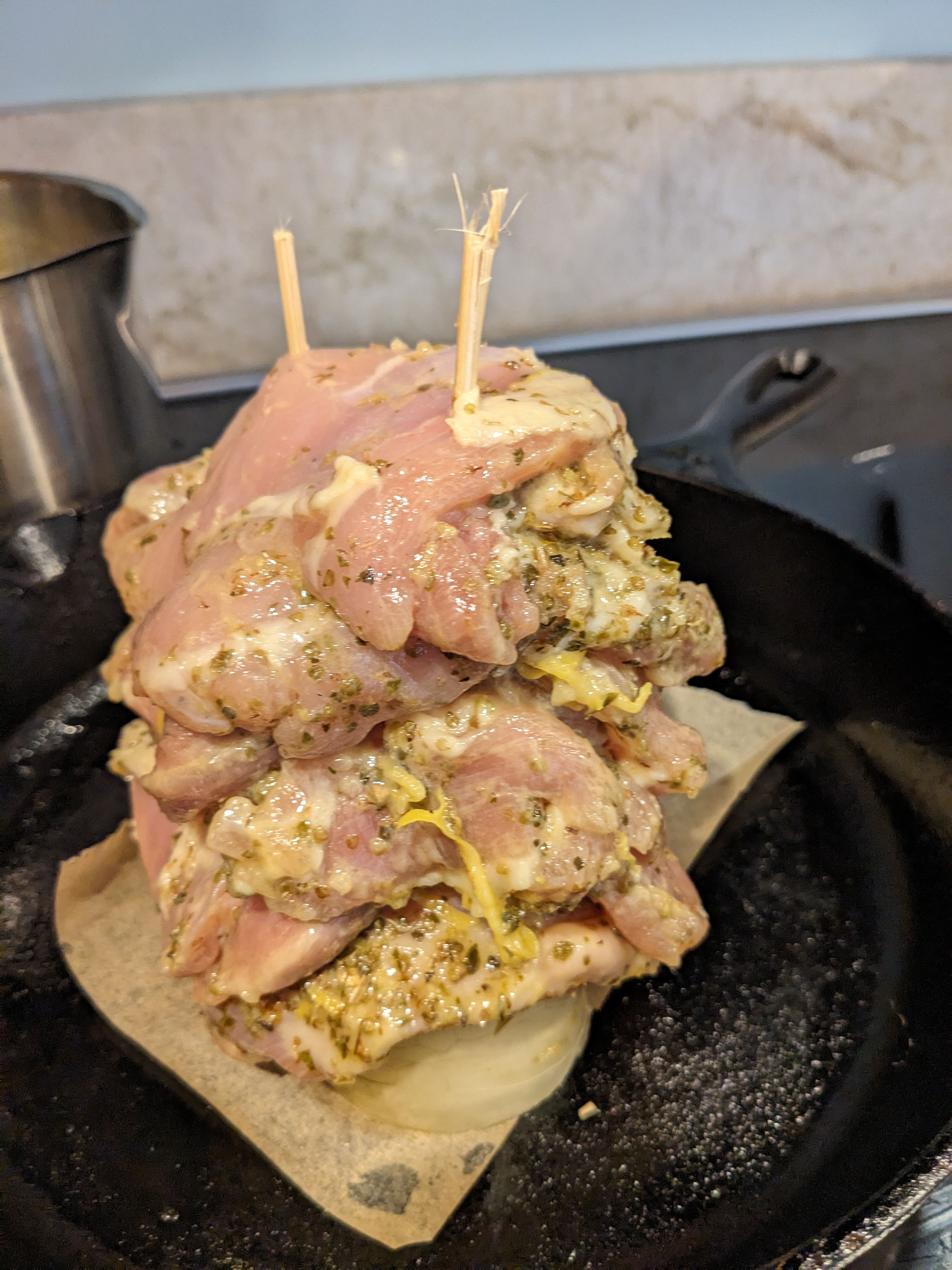 Once marinated, take the Vertical Gyro Spit Plate and thread the chicken thighs making sure to rotate each one opposite from the last.