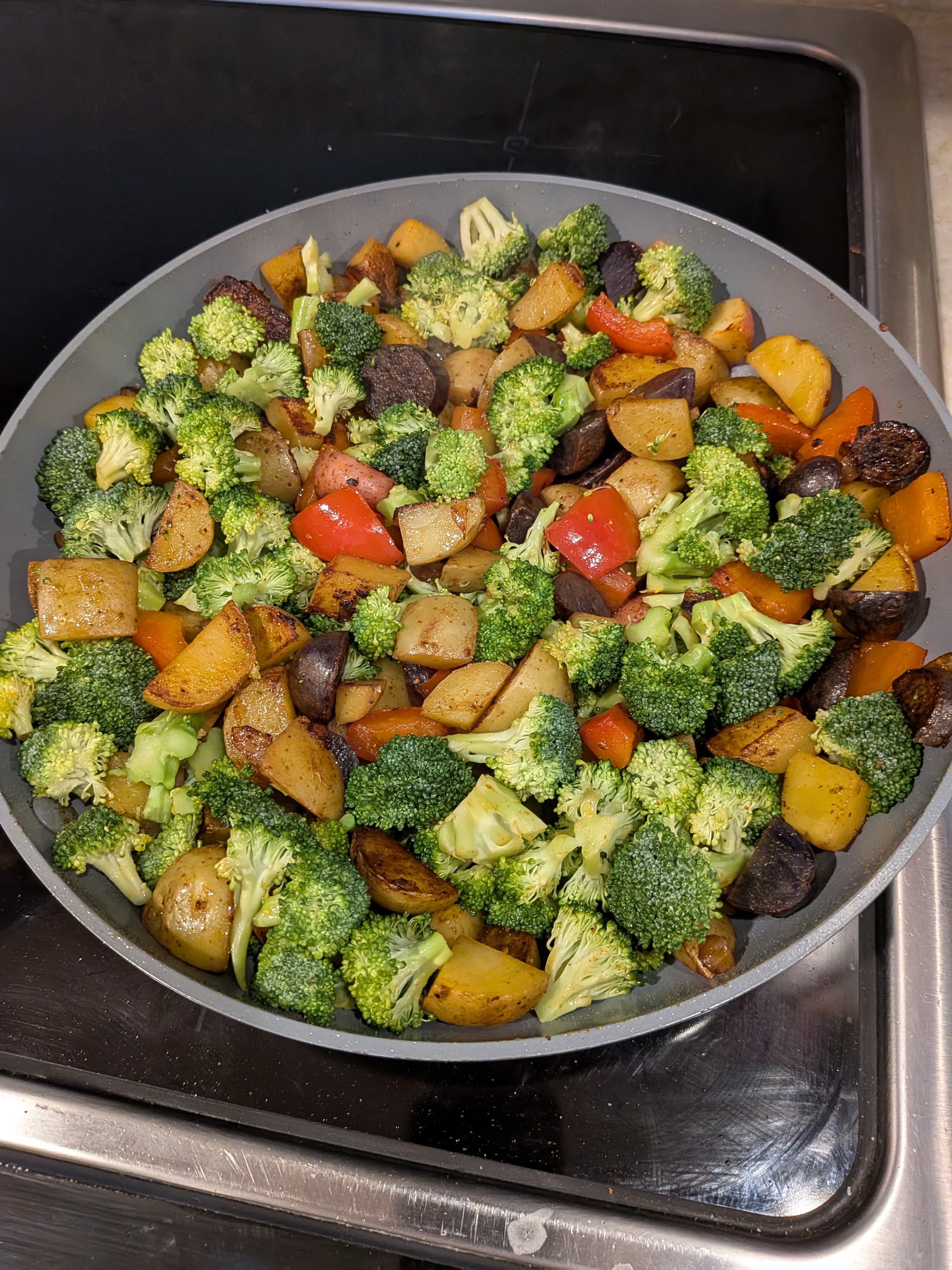 This is a quick and easy meal especially when you’re looking for breakfast for dinner. In fact this dish has become a bi-weekly staple. Love it because it cleans out the frig, makes many meals (breakfast, lunch and dinner) anyway the other day we were at Stop and Shop and they had those mini potatoes buy one get one free deals. I grabbed a bag of small Yellow potatoes and one of the mixed colors. made the cubing easier they were already small.