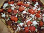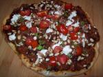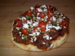 We had cooked a leg of lamb and frozen the leftovers. I took out of freezer for one of our weekday meals and when I opened the frig and saw it staring at me my gut started to say what do I have in here to make an interesting meal. Leftover spaghetti sauce (Lyn secret recipe), Tandoori NAAN All natural flat bread, feta cheese, pine nuts, scallions, fresh oregano, cherry tomatoes, pomegranate molasses . Note: The cherry tomatoes not in the frig of course but always on the counter, just started had the first two from the patio mmmmmmm nothing better. Ok inventory taken now what I asked myself looking at the clock Lyn would return soon from work she has the 50 mile commute and I have the 3.2 mile commute she does not get how difficult it can be stuck behind a school bus as opposed to 1-2 hours of stop and go traffic. Anyway… sauce on stove with minced lamb and some chopped fresh oregano added, brought to bubble and then turned off. Meanwhile I sliced scallion whites and greens, quartered the cherry tomatoes, slightly roasted a handful of pine nuts, crumbled the feta, and preheated oven to 400◦. I spread the sauce over the flat bread top with the other ingredients then drizzle with pomegranate molasses and into to oven for about 10 minutes or until I thought looked done.