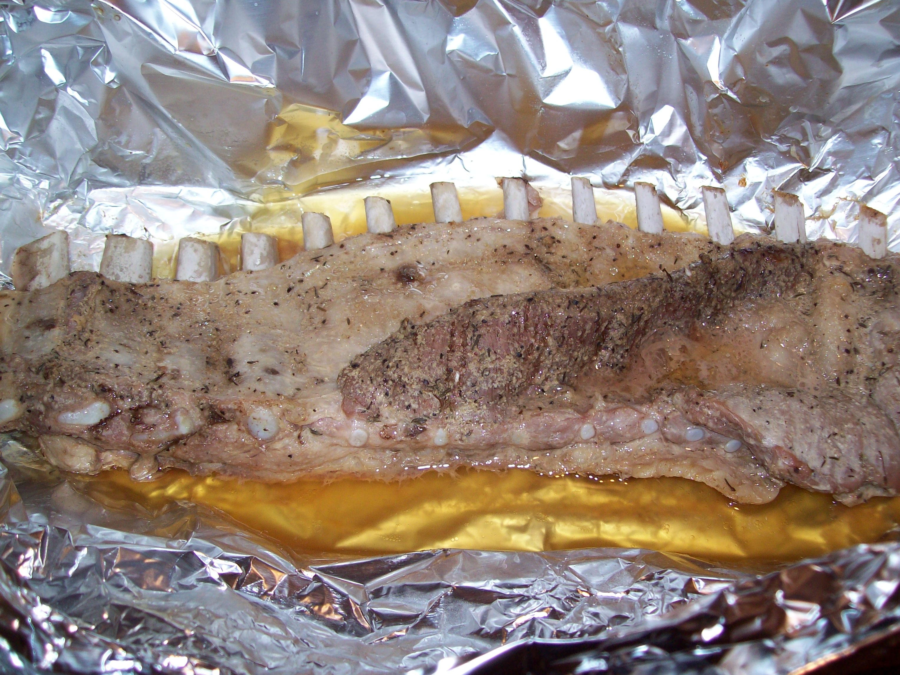Place the slab meat side down and fold the tinfoil to make an air tight package. Place on a cookie sheet and bake at 225 to 250 for around 2 hours – until tender and the meat is pulling off the end of bones.