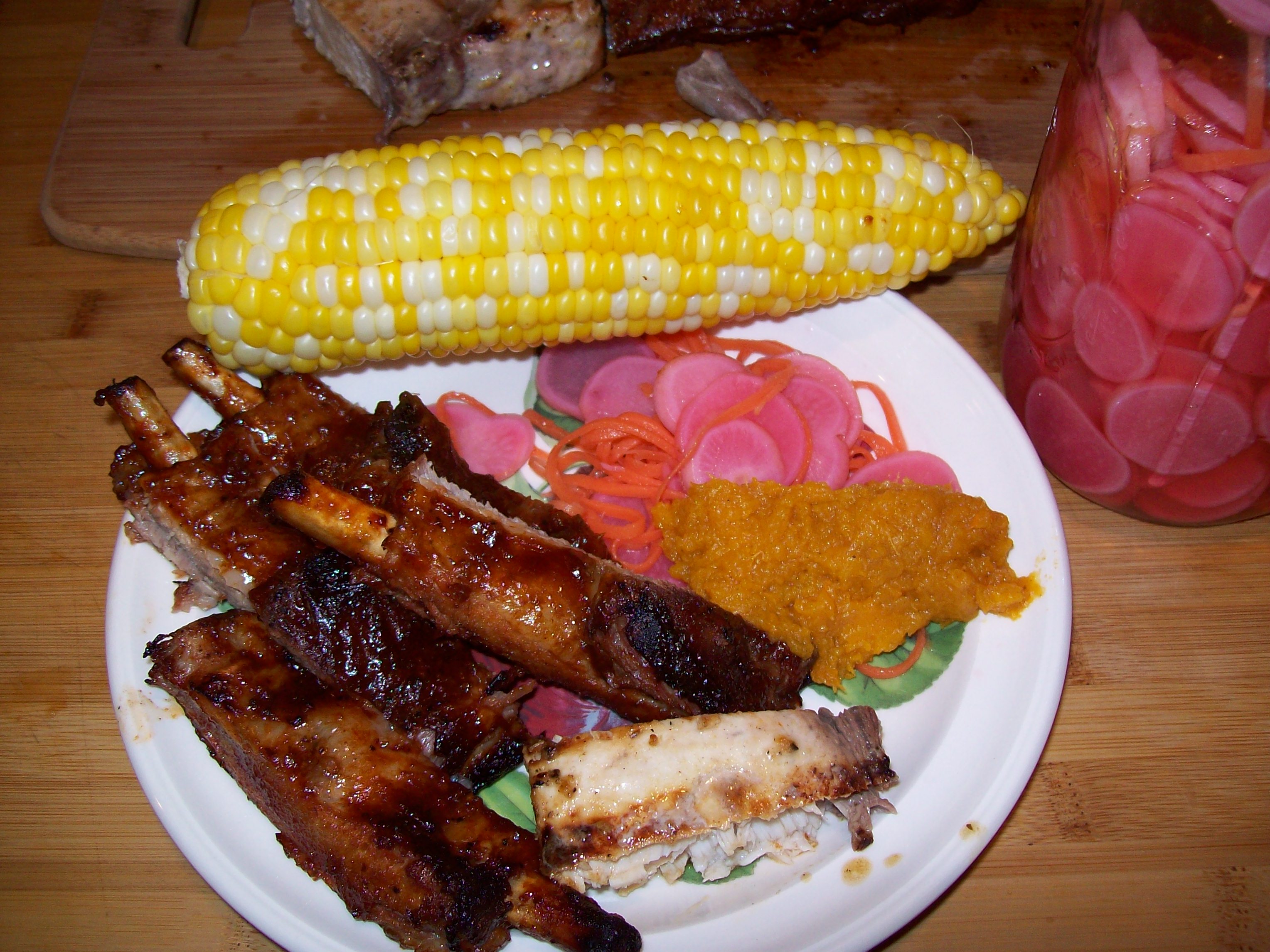A long time ago I had to stop eating fatty foods they started to do a number on my stomach. A few things made me decide to go for it this year, 4th of July with Lyn asking what are we going to BBQ and Gloria who recently found my site and wanted to know if I had any good rib recipes. To be truthful the last few times I made them I bought the precooked and just reheated, added my own sauce and there you had it quick and easy but I used to cook these and still had the how in my head. Last year I won a contest with my pulled pork and root beer BBQ sauce so I still have it in me. Then Wholefoods had St. Louis Style ribs on sale and I grabbed a slab, gave it a rub down and let it sit in the frig until yesterday. Cooking ribs are relatively easy just time consuming that being said there is a true art to cooking the perfect rib and I am still trying to master that I lift my smoker lid to all those that have satisfied my taste bud in my travels. I remember the road trip my brother and I took bringing Mom and Dad’s car down to Florida for them we had ribs all the way down each a different taste treat. I have to say there was a gap of eating ribs for me after that trip.