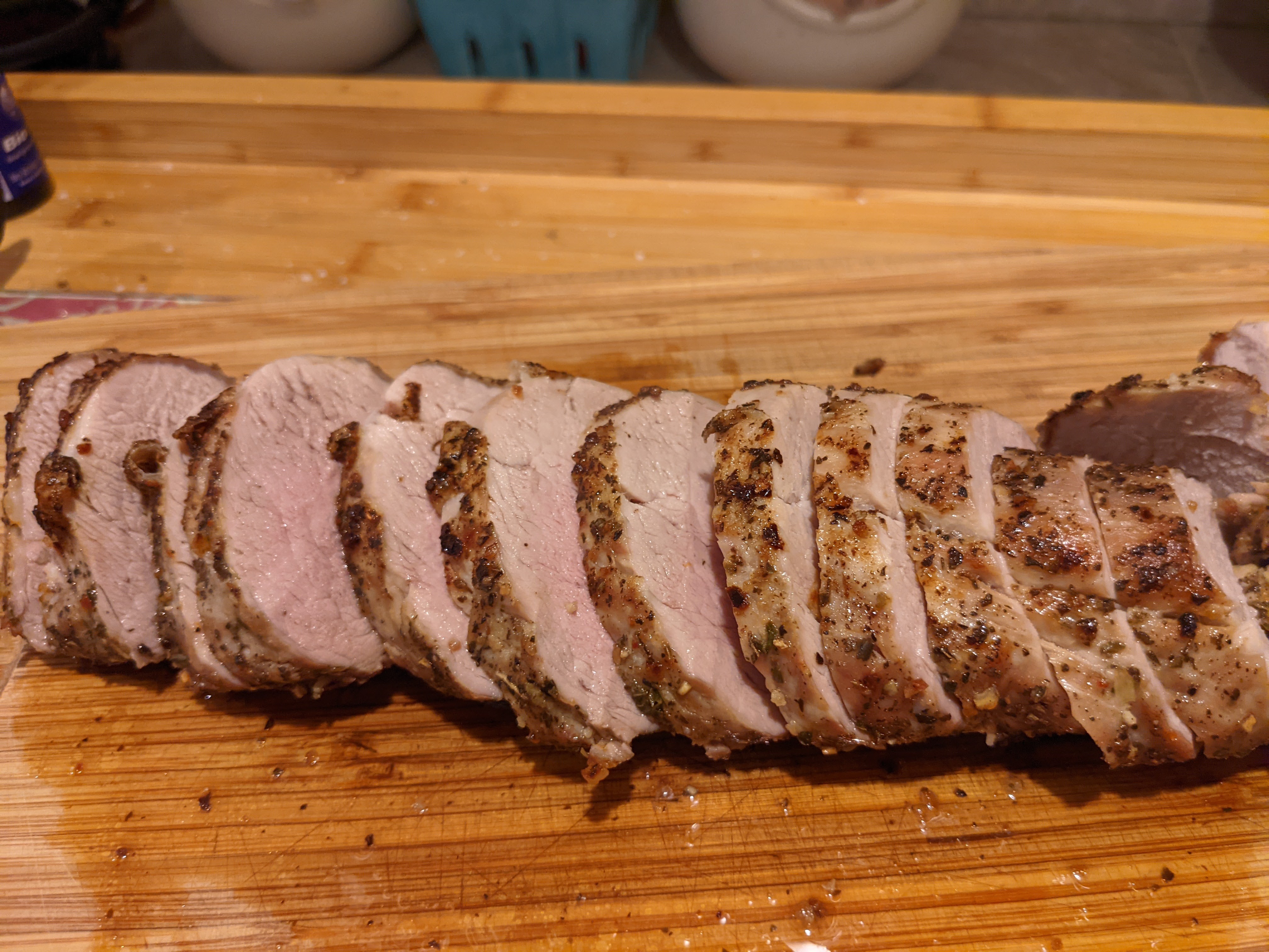 - Transfer pork to a cutting board and let rest for at least 10-15 minutes. Thinly-slice the pork and garnish with fresh herbs, if desired.