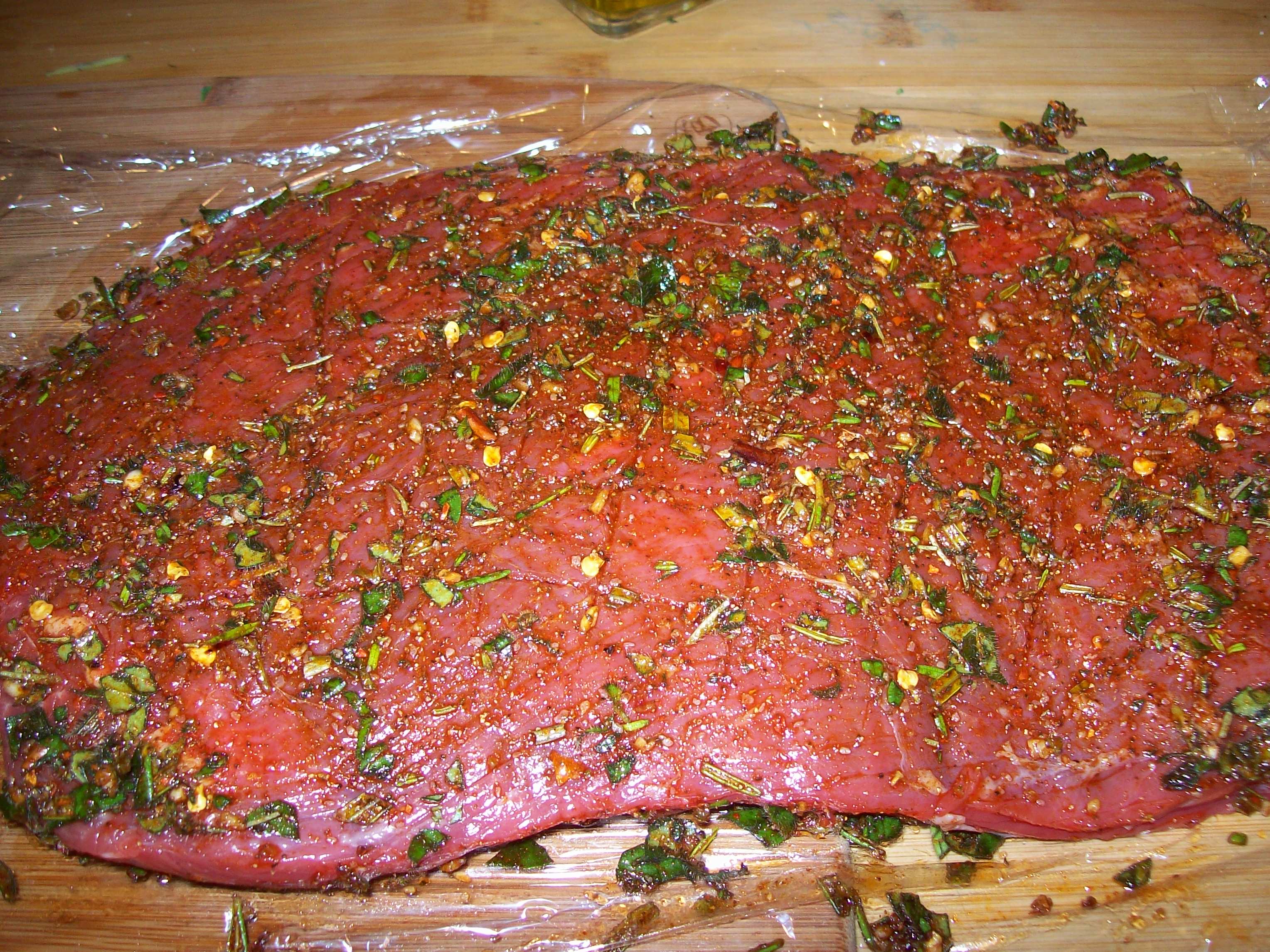 I love flank steak you can do so much with it tonight we are trying a stir fry, recipe to come. Anyway this is one of my favorite especially around late spring early summer when my rosemary is growing and calling me to run my hands along a sprig. I just love the smell it leaves on them. We tried many different combinations and came up with this but as I said we like to experiment so send me ideas you think might work.