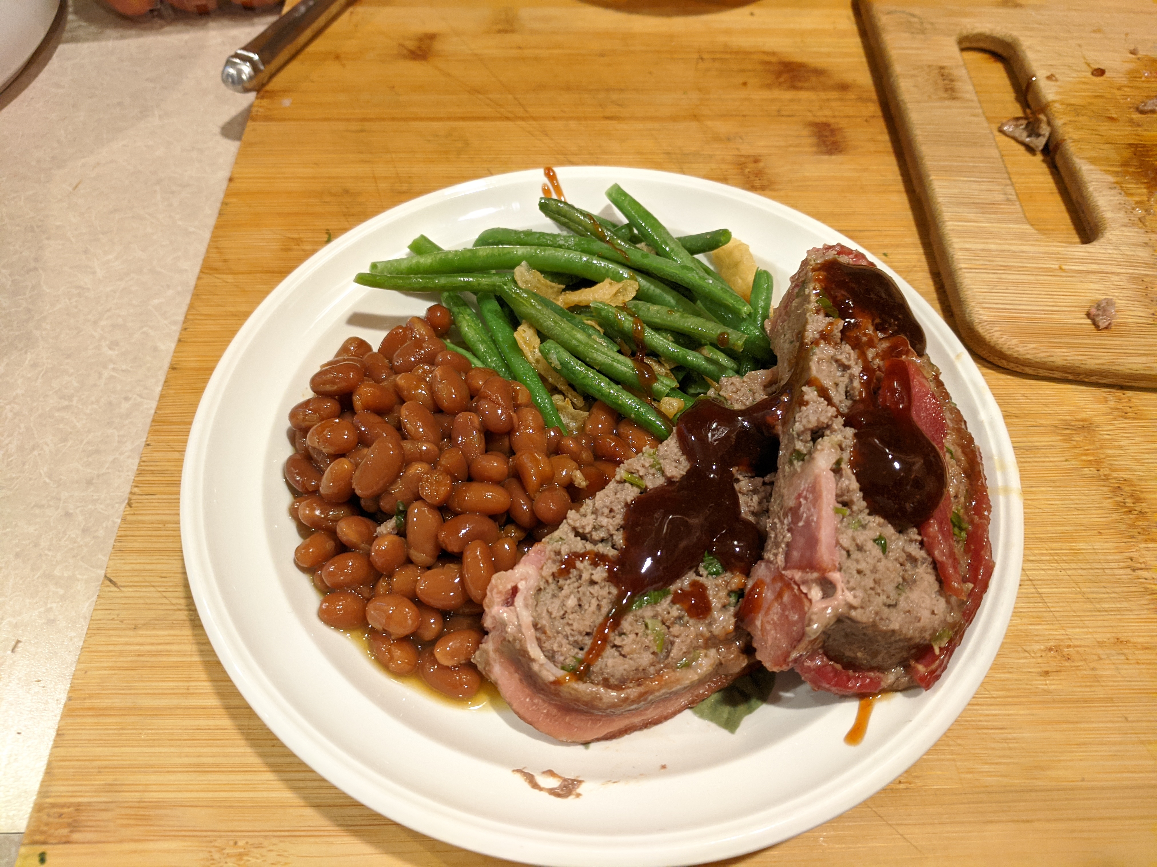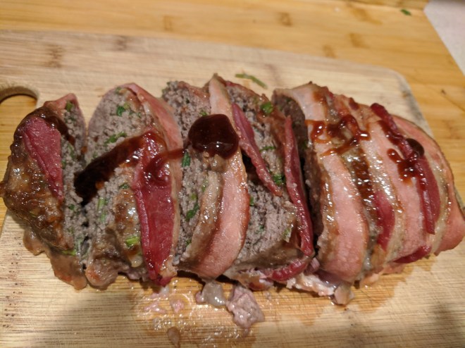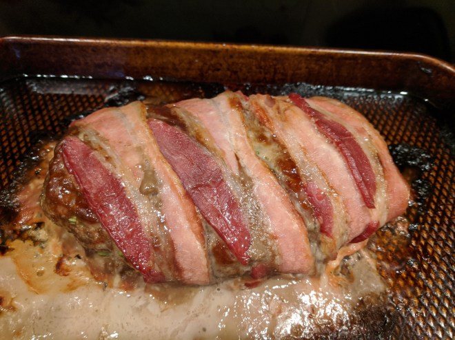 Cook for about 45 minutes to 1 hour or until meat is cooked through and the bacon is crisp. An instant read thermometer inserted in the center of the loaf should read 160°F. You can crisp up the bacon further, if you like, by placing meatloaf under the broiler for 30 seconds to 1 minute, taking care not to burn.