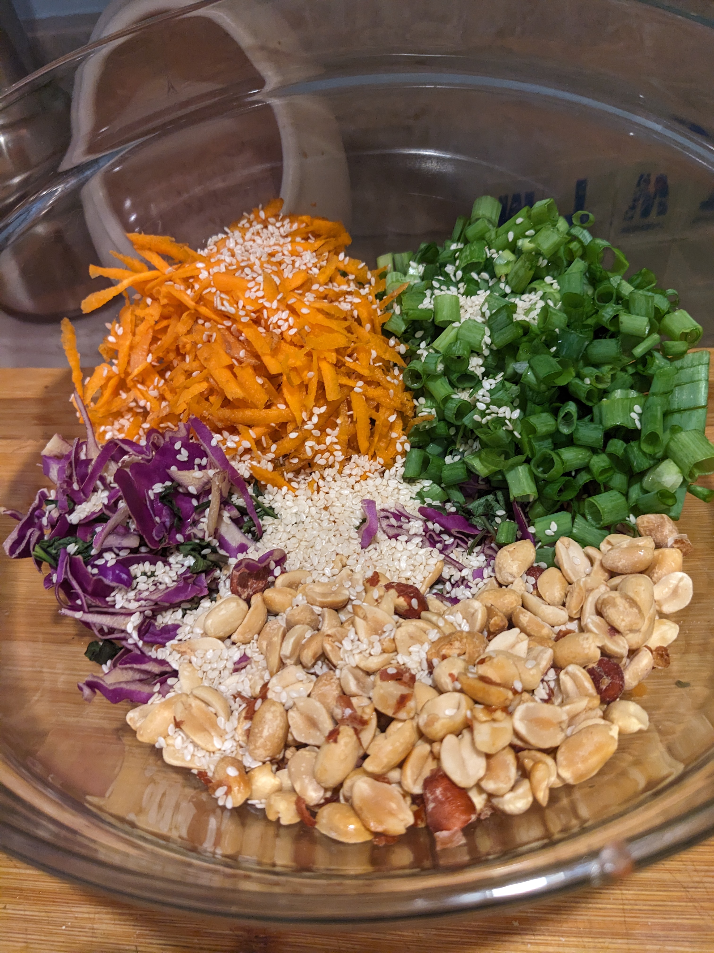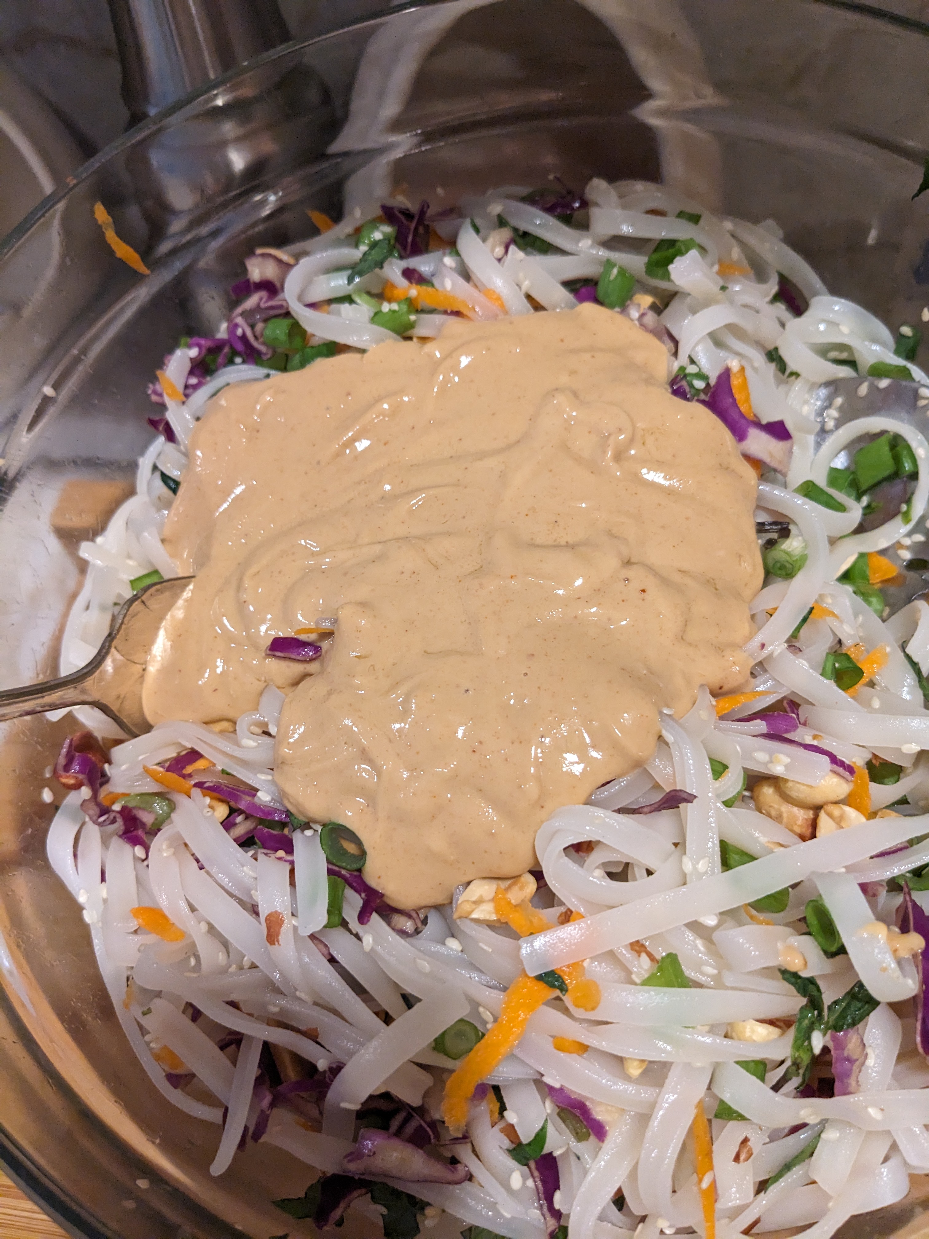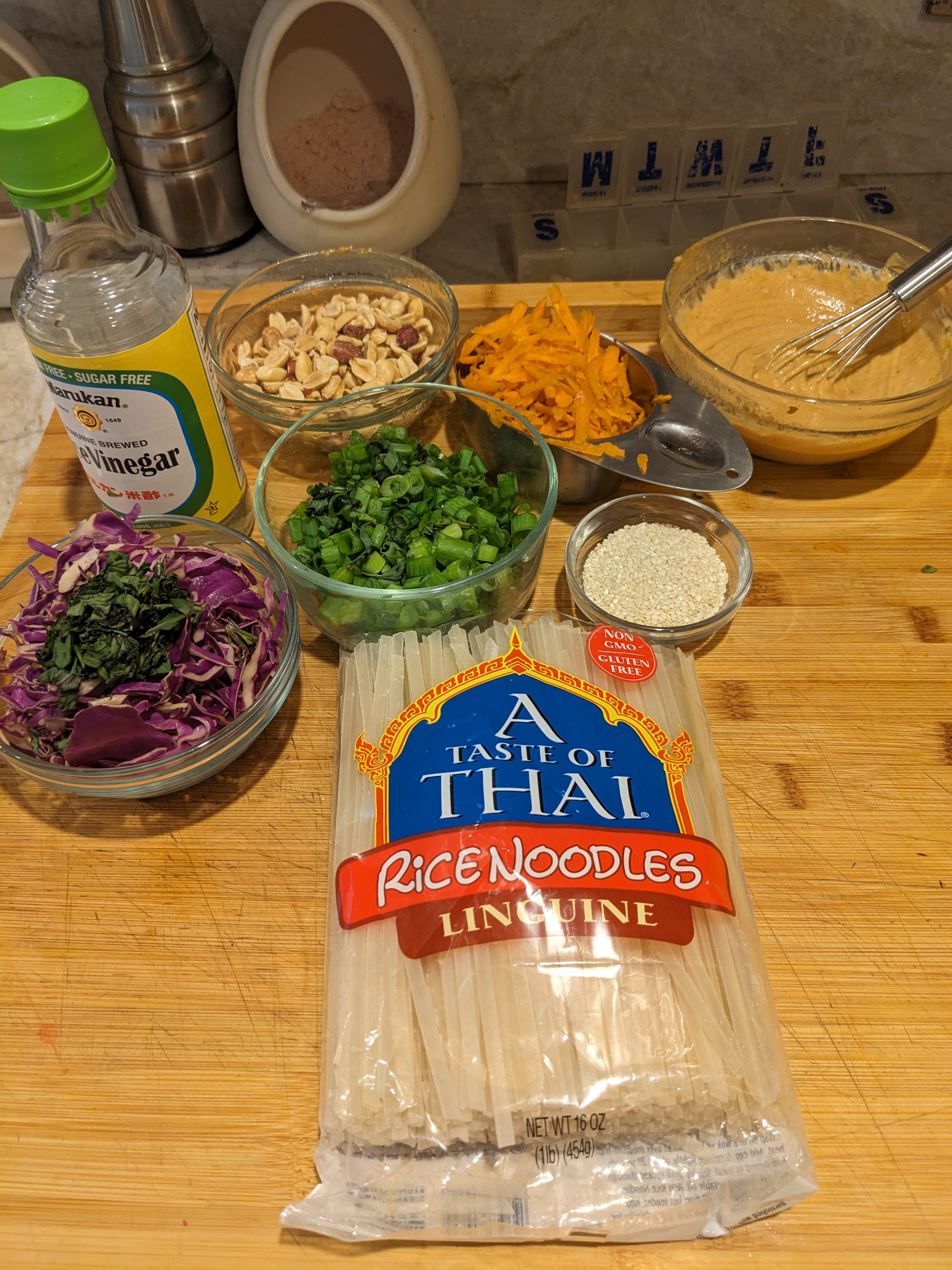• 8 ounces spaghetti, broken in half, cooked in plenty of salted water to al dente and rinsed well with cold water Steve Note: I used Thai Rice Noodles